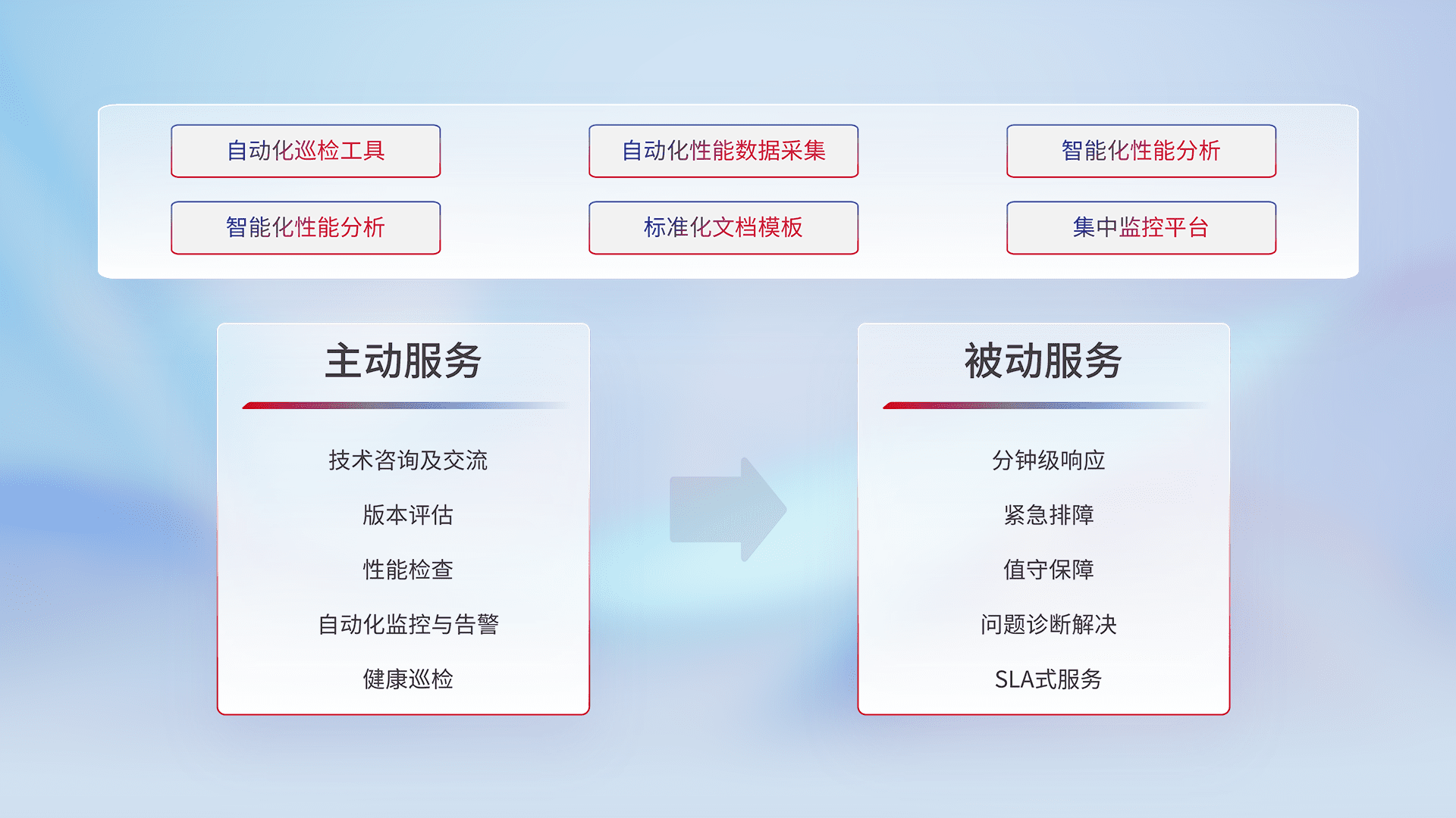 智能化工具和标准化文档,,,,保障服务质量,,提供主动服务(包含技术咨询、、、版本评估、、、、性能检查、、、自动化监控与告警、、、、健康巡检)和被动服务包含(分钟级响应、、、、紧急排障、、、值守保障、、问题诊断解决、、、SLA服务)。。。